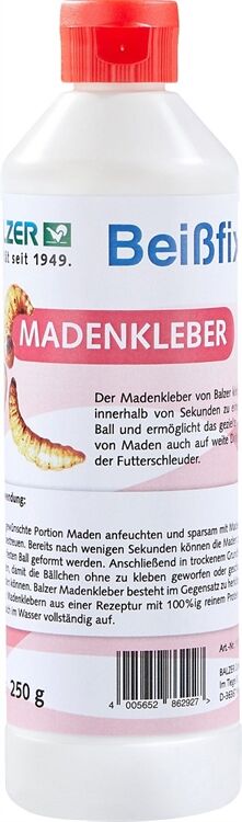 Madenkleber Beissfix: Der Madenkleber von Balzer klebt Maden innerhalb von Sekunden zu einem festen Ball und ermöglicht das gezielte Anfüttern von Maden auch auf weite Distanzen mit der Futterschleuder. Inhalt 250g.Technische Details