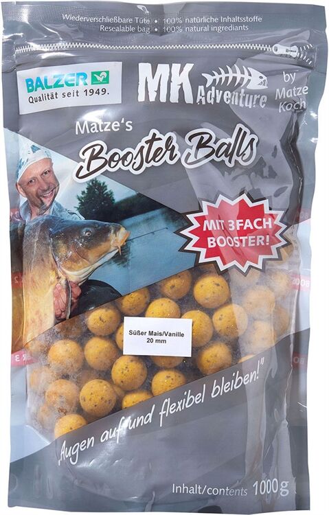 Matze brandneue Boilierange, die „Booster Balls“, kommen mit völlig neuen Eigenschaften daher. Sie haben die Eigenschaft, die wertvollen Inhaltsstoffe der Proteinkugeln noch schneller ans Wasser abzugeben. Umso effektiver setzen die Kugeln ihre Lockwirkung frei, und ziehen Fische aus großem Umkreis an die Futterstelle. Darüber hinaus hat Matze noch einmal an der Weiche seiner Kugeln gearbeitet. Trotz einer unglaublich attraktiven Konsistenz, die nachweislich mehr Fische fängt, halten sie die ganze Nacht lang am Haken. Bei extremen Weißfisch- oder Krebsproblemen, kann man auch die Booster Balls problemlos nachhärten lassen. Einfach einige Tage lang offen liegen lassen, bis der gewünschte Härtegrad erreicht ist. Matze schwört auf kleine Köder, darum hat er die kleinere Boilieausführung von 16 auf 15 Millimeter (exakt maßhaltig) korrigiert, neben der 20mm Standardvariante. Alle Sorten sind ab sofort mit passendem Pop Up (zum Teil als Fluovariante) und einem fängigen Dip erhältlich. NHALTSSTOFFE Matzes neue Boilieserie gibt die wertvollen Inhaltsstoffe und Aromen noch schneller und über viele Stunden an´s Wasser ab. Machen sie selber den Versuch im Wasserglas und beobachten sie das Verhalten der neuen Kugeln über eine Stunde und sie werden verstehen, warum die Karpfen so ausflippen. WEICHE KONSISTENZ Bekannt für die besonders attraktive, weiche Konsistenz seiner Karpfenkugeln setzt Matze mit dieser Serie einen drauf. Die Tüten sind wiederverschließbar. Drücken sie vor dem Versiegeln möglichst viel Luft aus der Tüte. So bleiben die Kugeln weich. Sollten härtere Kugeln erforderlich sein, lassen sich die Köder jetzt noch besser und schneller nachhärten. NEUE REZEPTUREN Matze hat lange an den neuen, raffinierten Rezepturen rumgetüftelt. Auch bei gröberen Bestandteilen ermöglichen sie einen guten Zusammenhalt und geben den Karpfen das Gefühl der natürlichen Nahrungsaufnahme, bei der es in den Schlundzähnen knackt. • Inhalt: 1000g • Wiederverschließbare Tüte • 100% natürliche Inhaltsstoffe • VPE: je 5 wiederverschließbare TütenHersteller
