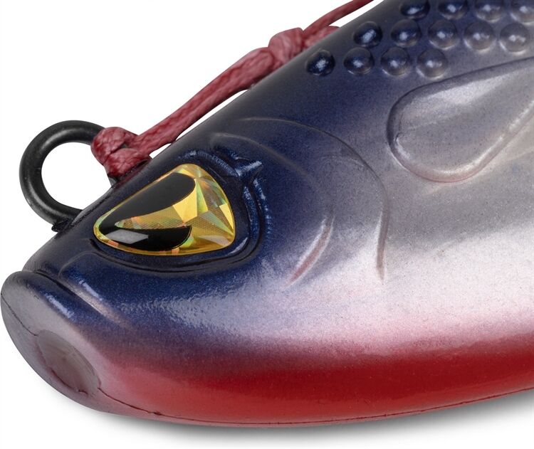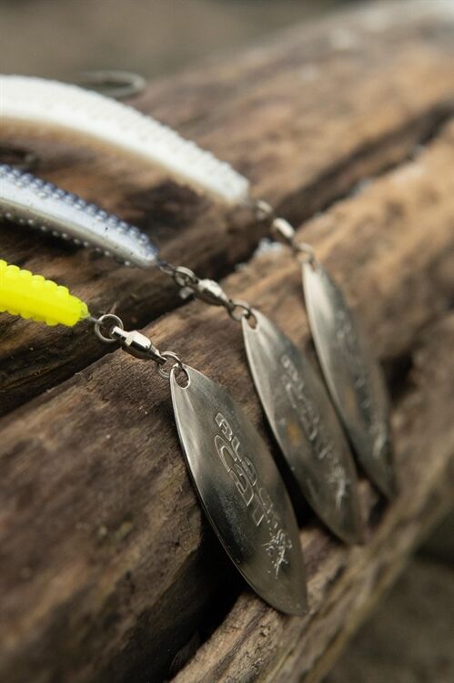 • Stark vibrierendes, aufblitzendes Schwanzblatt und seitliche Noppen, die das Wasser aufwirbeln.