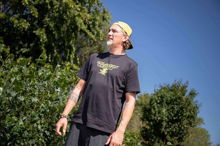 • Schwarz mit großem „Distressed“-Black-Cat-Logo auf der Brust