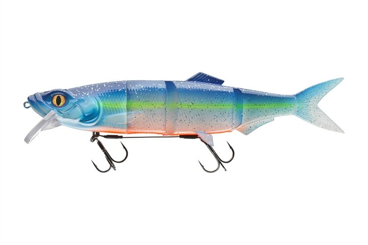 Dieser Köder besitzt eine hervorragende Aktion, die an die Schwimmbewegungen eines echten Fisches erinnert – dabei bricht der Köder unter konstantem Zug immer mal wieder leicht seitlich, flankend aus und imitiert so einen verletzten Beutefisch. Der Prorex Hybrid Swimbait wird komplett angelfertig und geriggt geliefert und ist somit sofort einsatzbereit. Der hintere Drilling wird dabei direkt an den 60-lbs-Stahldraht angebracht, da gerade bei kapitalen Ausnahmefischen die Gefahr besteht, dass der Draht bei starker Belastung in den Sprengring einfädelt und der Fisch verloren geht.
